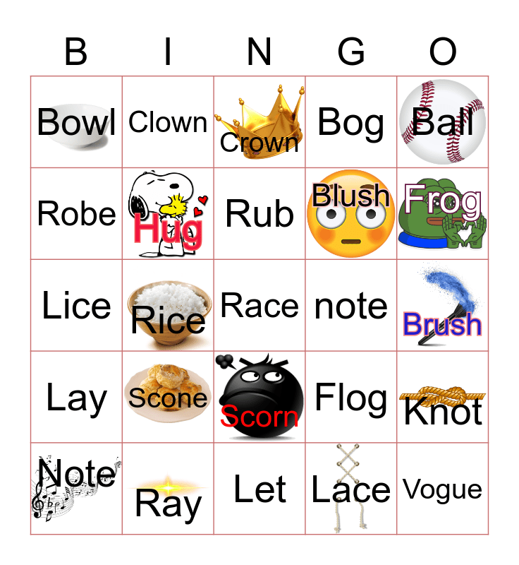 This bingo card has 14 images and 25 words: Lay, Ray, Race, Lace, Ball, Bowl, Clown, Crown, note, Knot, Robe, Hug, Let, Flog, Frog, Note, Rice, Rub, Blush, Brush, Lice, Scone, Scorn, Bog and Vogue.