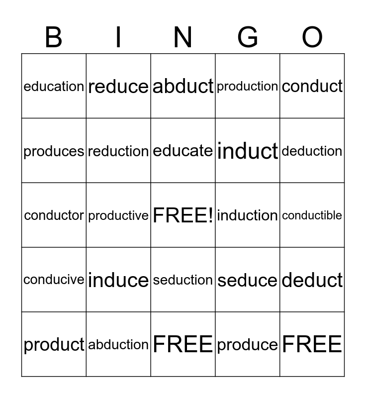 This bingo card has a free space and 24 words: induce, abduction, educate, product, conduct, education, produces, reduce, induction, seduction, induct, conductor, seduce, deduct, reduction, produce, conductible, abduct, deduction, productive, FREE, conducive, production and FREE.