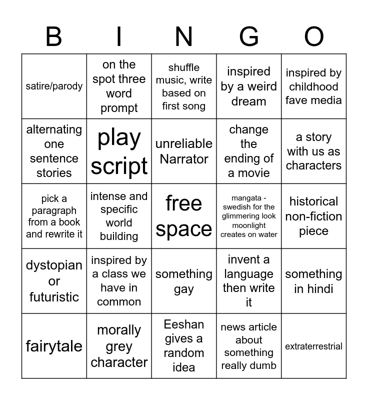 This bingo card has a free space and 24 words: inspired by a class we have in common, morally grey character, unreliable Narrator, fairytale, inspired by childhood fave media, satire/parody, alternating one sentence stories, on the spot three word prompt, mangata - swedish for the glimmering look moonlight creates on water, something gay, change the ending of a movie, pick a paragraph from a book and rewrite it, invent a language then write it, something in hindi, play script, news article about something really dumb, historical non-fiction piece, shuffle music, write based on first song, a story with us as characters, intense and specific world building, extraterrestrial, dystopian or futuristic, inspired by a weird dream and Eeshan gives a random idea.