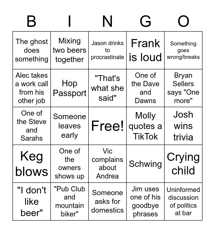This bingo card has a free space and 24 words: One of the owners shows up, "Pub Club and mountain biker", "That's what she said", "I don't like beer", Something goes wrong/breaks, The ghost does something, Alec takes a work call from his other job, Mixing two beers together, Molly quotes a TikTok, Vic complains about Andrea, One of the Dave and Dawns, One of the Steve and Sarahs, Schwing, Crying child, Hop Passport, Jim uses one of his goodbye phrases, Josh wins trivia, Jason drinks to procrastinate, Bryan Sellers says "One more", Someone leaves early, Uninformed discussion of politics at bar, Keg blows, Frank is loud and Someone asks for domestics.