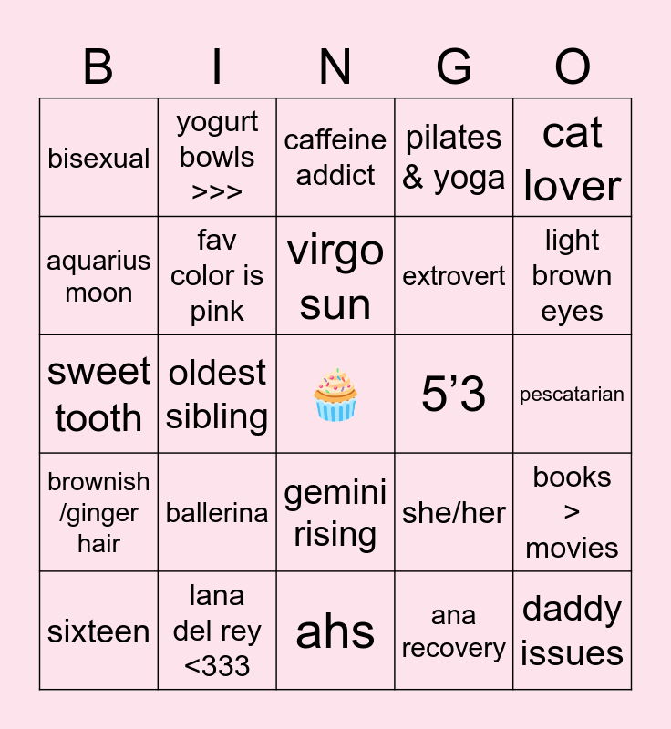 This bingo card has a free space and 24 words: sixteen, ballerina, virgo sun, ana recovery, cat lover, bisexual, yogurt bowls >>>, caffeine addict, 5’3, pescatarian, sweet tooth, fav color is pink, she/her, books > movies, aquarius moon, lana del rey <333, ahs, pilates & yoga, light brown eyes, brownish /ginger hair, oldest sibling, gemini rising, extrovert and daddy issues.