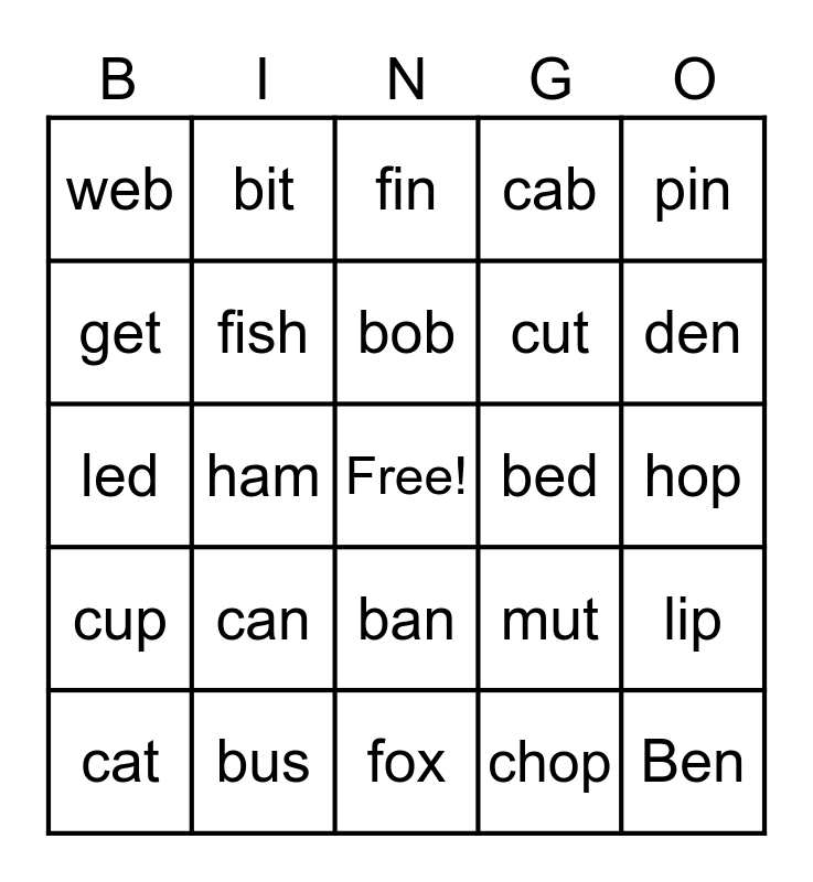 This bingo card has a free space and 24 words: can, bus, bob, cat, pin, web, get, bit, bed, ban, cut, led, mut, lip, fish, chop, hop, fin, den, ham, Ben, cup, cab and fox.