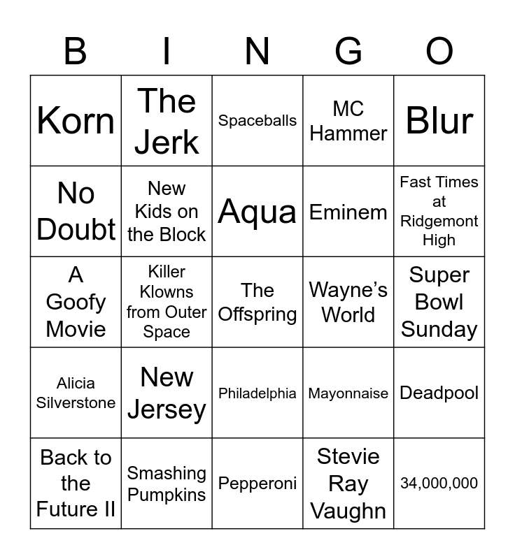 This bingo card has 60 words: Rage Against the Machine, Smashing Pumpkins, Nirvana, Alicia Silverstone, Stevie Ray Vaughn, Dookie, New Kids on the Block, Beastie Boys, Eminem, House of Pain, MC Hammer, Nine Inch Nails, No Doubt, Alanis Morisette, TOOL, Korn, The Offspring, Blur, Jay Z, Aqua, Wayne’s World, Spaceballs, Back to the Future II, Deadpool, Toy Story, Enchanted, Rough Night, Saturday Night Fever, Fast Times at Ridgemont High, Dodgeball, The Princess Diaries, Miss Congeniality, Inside Out, Whiplash, The Jerk, Stripes, Do the Right Thing, Killer Klowns from Outer Space, Iron Man, A Goofy Movie, South America, New Jersey, Super Bowl Sunday, Tofu, Mayonnaise, Canada, Pizza Hut, Papa John’s, Egypt, Philadelphia, Pepperoni, Sausage, Anchovies, Mozzarella, 1962, 997, 200, 12,000, 34,000,000 and 11.