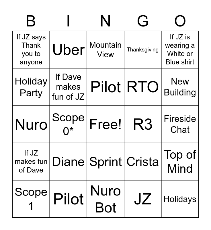 This bingo card has a free space and 32 words: JZ, Dave, Scope 0*, Autonomy, If JZ makes fun of Dave, If Dave makes fun of JZ, If JZ is wearing a White or Blue shirt, Top of Mind, Uber, Uber Eats, Pilot, Mountain View, Houston, P2, R3, Fedex, Scope 1, Nuro, Sprint, Diane, Crista, David, Fireside Chat, Pilot, Holidays, Thanksgiving, RTO, Holiday Party, If JZ says Thank you to anyone, Nuro Bot, HQ and New Building.