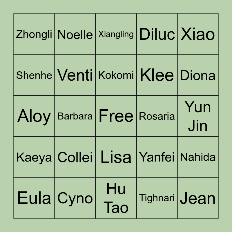This bingo card has a free space and 56 words: Bennett, Eula, Kazuha, Zhongli, Hu Tao, Ganyu, Venti, Albedo, Klee, Ayaka, Diluc, Keqing, Itto, Mona, Raiden Shogun, Tartaglia, Xiao, Barbara, Fischl, Jean, Rosaria, Razor, Yanfei, Xiangling, Yoimiya, Kokomi, Thoma, Chongyun, Diona, Xingqui, Sayu, Kujou Sara, Sucrose, Gorou, Yun Jin, Shenhe, Aloy, Beidou, Kaeya, Noelle, Lisa, Ningguang, Qiqi, Amber, Candace, Collei, Cyno, Dori, Shinobu, Heizou, Tighnari, Scarmouche, Layla, Farzuan, Nahida and Nilou.