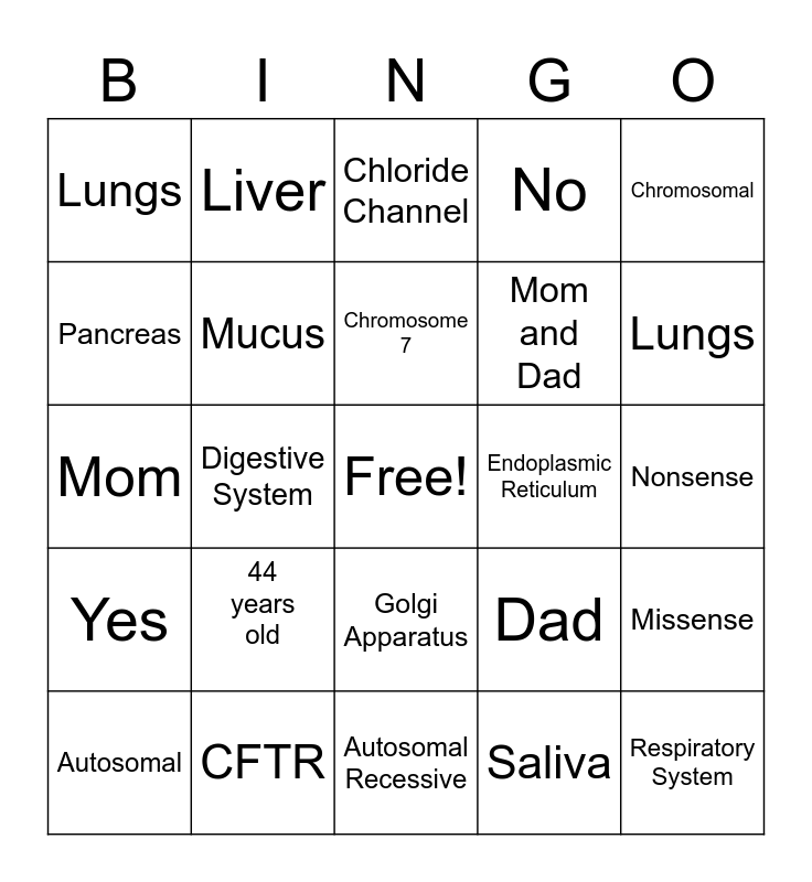 This bingo card has a free space and 24 words: 44 years old, CFTR, Chromosome 7, Autosomal, Chromosomal, Lungs, Pancreas, Liver, Endoplasmic Reticulum, Golgi Apparatus, Mom and Dad, Mom, Dad, Missense, Mucus, Saliva, Nonsense, Chloride Channel, Lungs, Digestive System, Respiratory System, Yes, No and Autosomal Recessive.