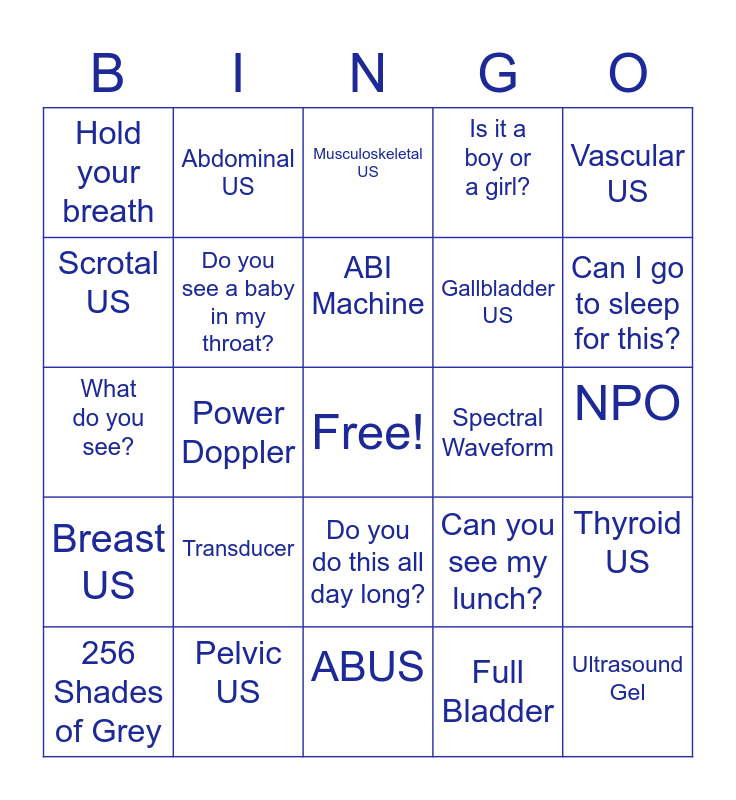 This bingo card has a free space and 24 words: Transducer, Pelvic US, ABI Machine, 256 Shades of Grey, Vascular US, Hold your breath, Scrotal US, Abdominal US, Spectral Waveform, Do you do this all day long?, Gallbladder US, What do you see?, Can you see my lunch?, Thyroid US, Do you see a baby in my throat?, Full Bladder, NPO, Musculoskeletal US, Can I go to sleep for this?, Power Doppler, Ultrasound Gel, Breast US, Is it a boy or a girl? and ABUS.