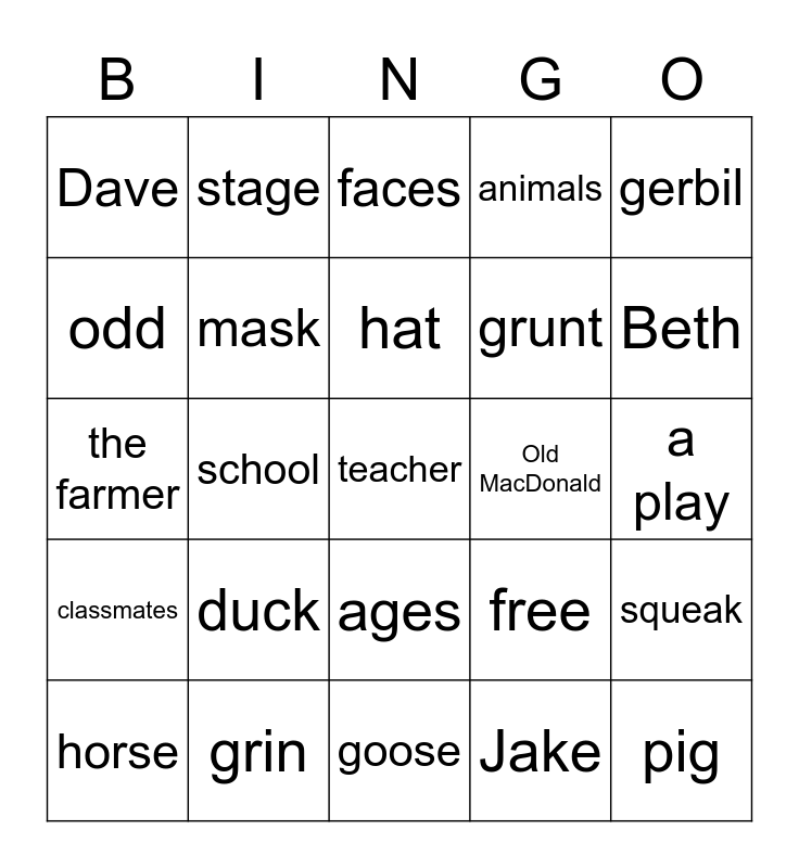 This bingo card has 25 words: duck, goose, hat, horse, gerbil, Dave, odd, stage, Old MacDonald, ages, grunt, the farmer, free, squeak, mask, pig, a play, faces, Beth, school, teacher, grin, classmates, animals and Jake.