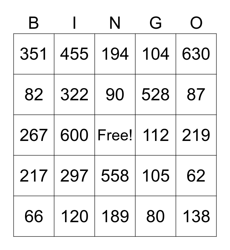 This bingo card has a free space and 24 words: 297, 120, 90, 66, 630, 351, 82, 455, 112, 558, 528, 267, 105, 62, 322, 80, 219, 194, 87, 600, 138, 217, 104 and 189.