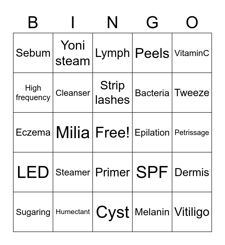 This bingo card has a free space and 29 words: Sugaring, Comedone, Milia, Elastin, Sebum, Lymph, Cleanser, Steamer, Epilation, Humectant, Petrissage, Vitiligo, Cyst, Melanin, Tweeze, Toner, Primer, LED, VitaminC, Eczema, SPF, Papule, Bacteria, High frequency, Peels, Yoni steam, Dermis, Strip lashes and Saponification.