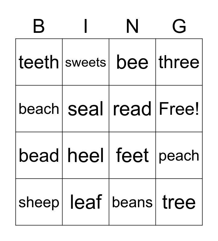 This bingo card has 18 words: heel, tree, bee, teeth, feet, three, sheep, sweets, Free!, bead, beans, beach, peach, seal, read, meat, leaf and peas.