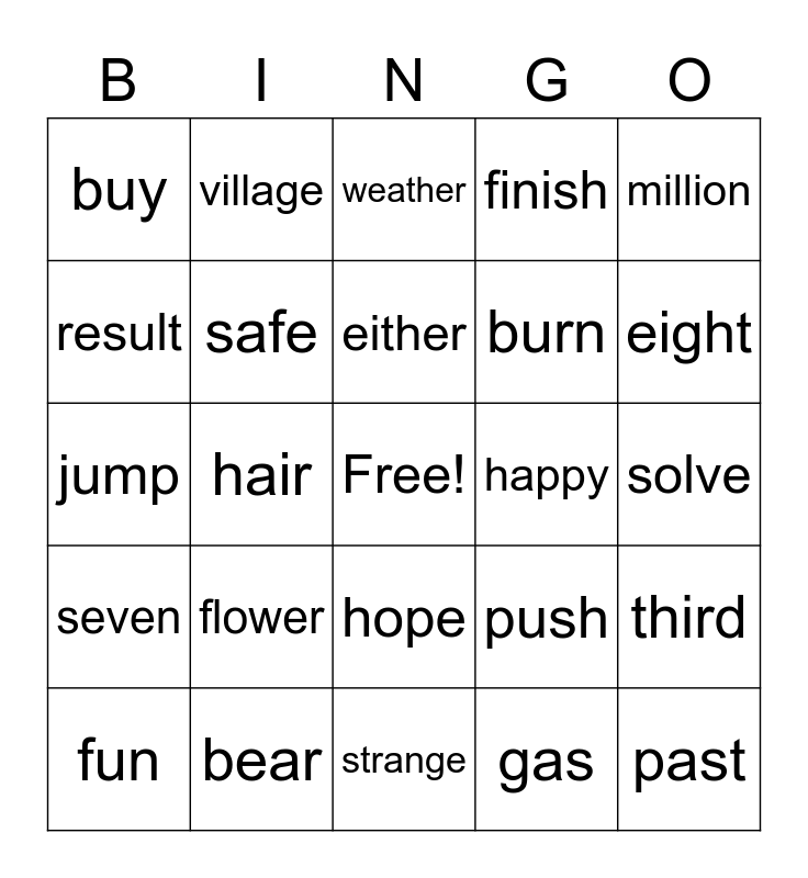 This bingo card has a free space and 44 words: visit, past, soft, fun, bright, gas, weather, month, million, bear, finish, happy, hope, flower, clothe, strange, gone, jump, baby, eight, village, meet, root, buy, raise, solve, metal, whether, push, seven, paragraph, third, shall, held, hair, describe, cook, floor, either, result, burn, hill, safe and cat.