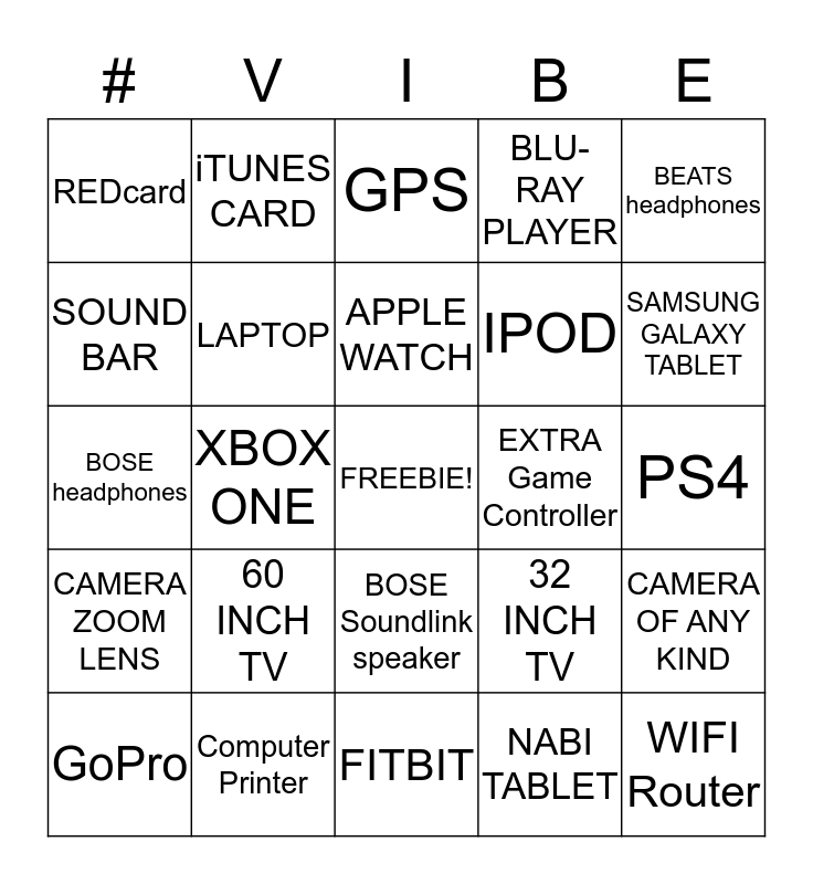 This bingo card has a free space and 24 words: 60 INCH TV, Computer Printer, APPLE WATCH, GoPro, BEATS headphones, REDcard, SOUND BAR, iTUNES CARD, EXTRA Game Controller, BOSE Soundlink speaker, IPOD, BOSE headphones, 32 INCH TV, CAMERA OF ANY KIND, LAPTOP, NABI TABLET, PS4, GPS, SAMSUNG GALAXY TABLET, XBOX ONE, WIFI Router, CAMERA ZOOM LENS, BLU-RAY PLAYER and FITBIT.