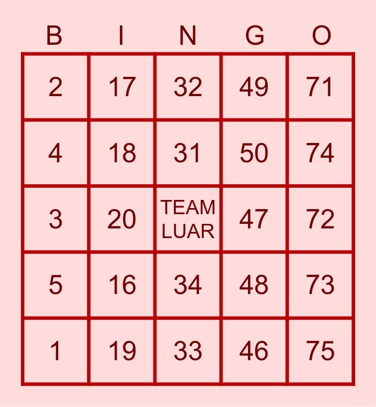 This bingo card has a free space and 24 words: 1, 16, 31, 46, 71, 2, 17, 32, 47, 72, 3, 18, 48, 73, 4, 19, 33, 49, 74, 5, 20, 34, 50 and 75.
