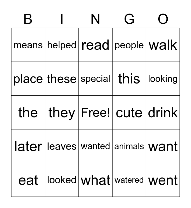 This bingo card has a free space and 28 words: want, looks, this, watered, place, read, helped, later, cute, eat, the, people, looked, what, looking, every, leaves, these, special, wanted, means, waited, went, they, drink, animals, walk and walked.