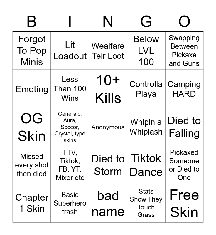This bingo card has a free space and 24 words: TTV, Tiktok, FB, YT, Mixer etc, Basic Superhero trash, 10+ Kills, Chapter 1 Skin, Swapping Between Pickaxe and Guns, Forgot To Pop Minis, Emoting, Lit Loadout, Whipin a Whiplash, Died to Storm, Controlla Playa, OG Skin, Tiktok Dance, Pickaxed Someone or Died to One, Less Than 100 Wins, Stats Show They Touch Grass, Died to Falling, Wealfare Teir Loot, Camping HARD, Generaic, Aura, Soccor, Crystal, type skins, Free Skin, Missed every shot then died, Below LVL 100 and bad name.