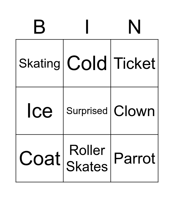 This bingo card has a free space and 14 words: Weather, Sweater, Coat, Cold, Ice, Parrot, Party, Pirate, Roller Skates, Skating, Sunny, Clown, Ticket and coat.