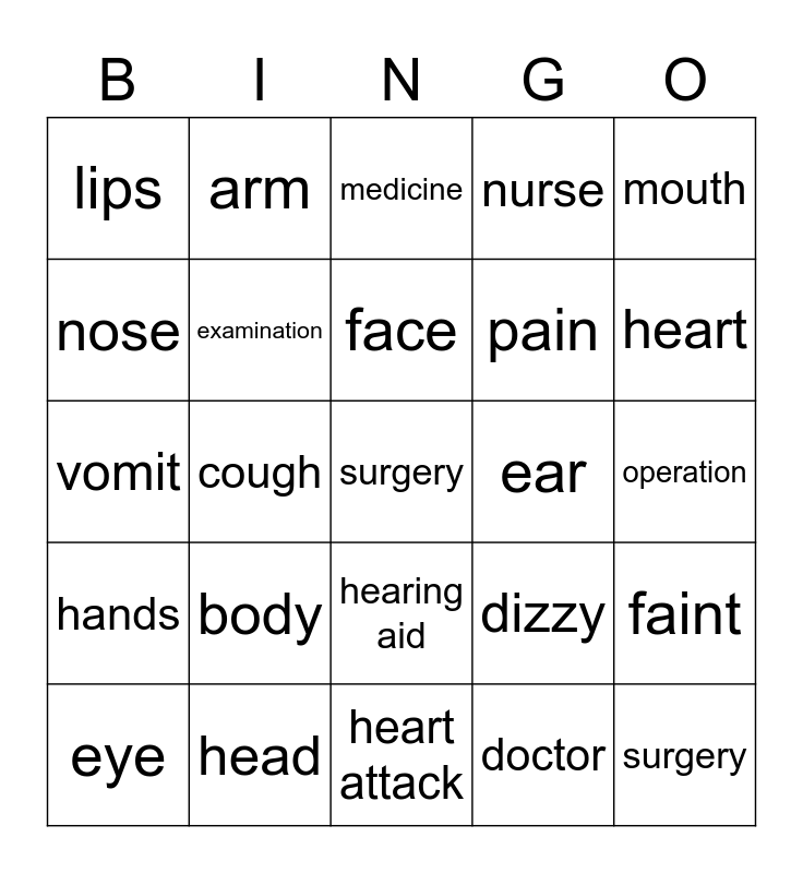 This bingo card has a free space and 24 words: body, head, face, eye, mouth, lips, nose, arm, ear, hearing aid, pain, vomit, dizzy, faint, examination, doctor, operation, medicine, heart, cough, surgery, hands, nurse and heart attack.