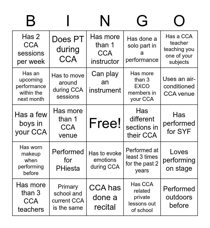 This bingo card has a free space and 24 words: Performed for PHiesta, Primary school and current CCA is the same, Can play an instrument, Has more than 3 CCA teachers, Has a CCA teacher teaching you one of your subjects, Has 2 CCA sessions per week, Has an upcoming performance within the next month, Does PT during CCA, Has different sections in their CCA, Has to evoke emotions during CCA, Has more than 3 EXCO members in your CCA, Has a few boys in your CCA, Performed at least 3 times for the past 2 years, Loves performing on stage, Has to move around during CCA sessions, Has CCA related private lessons out of school, Has performed for SYF, Has more than 1 CCA instructor, Uses an air-conditioned CCA venue, Has more than 1 CCA venue, Performed outdoors before, Has worn makeup when performing before, Has done a solo part in a performance and CCA has done a recital.