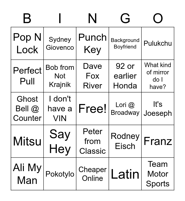 This bingo card has a free space and 24 words: Say Hey, Pokotylo, Dave Fox River, Ali My Man, Pulukchu, Pop N Lock, Perfect Pull, Sydney Giovenco, Lori @ Broadway, Peter from Classic, 92 or earlier Honda, Ghost Bell @ Counter, Rodney Eisch, Franz, Bob from Not Krajnik, Latin, It's Joeseph, Punch Key, What kind of mirror do I have?, I don't have a VIN, Team Motor Sports, Mitsu, Background Boyfriend and Cheaper Online.