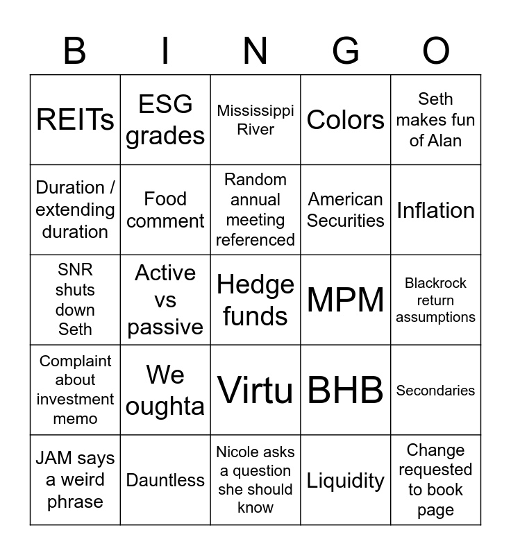 This bingo card has 25 words: We oughta, Nicole asks a question she should know, Random annual meeting referenced, JAM says a weird phrase, Seth makes fun of Alan, REITs, Duration / extending duration, ESG grades, MPM, Virtu, American Securities, SNR shuts down Seth, BHB, Secondaries, Food comment, Change requested to book page, Blackrock return assumptions, Mississippi River, Inflation, Active vs passive, Hedge funds, Dauntless, Complaint about investment memo, Colors and Liquidity.