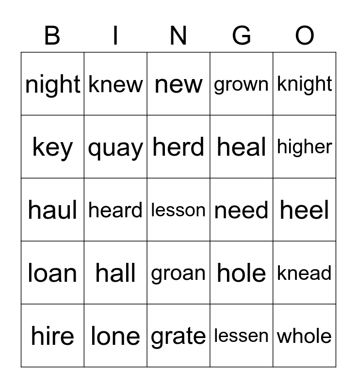 This bingo card has 25 words: loan, lone, lesson, lessen, knight, night, knew, new, need, knead, key, quay, grate, hole, higher, hire, heard, herd, heal, heel, haul, hall, groan, grown and whole.