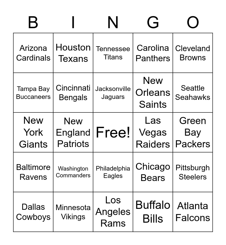 This bingo card has a free space and 32 words: Buffalo Bills, Miami Dolphins, New England Patriots, New York Jets, Baltimore Ravens, Cincinnati Bengals, Cleveland Browns, Pittsburgh Steelers, Houston Texans, Indianapolis Colts, Jacksonville Jaguars, Tennessee Titans, Denver Broncos, Kansas City Chiefs, Las Vegas Raiders, Los Angeles Chargers, Dallas Cowboys, New York Giants, Philadelphia Eagles, Washington Commanders, Chicago Bears, Detroit Lions, Green Bay Packers, Minnesota Vikings, Atlanta Falcons, Carolina Panthers, New Orleans Saints, Tampa Bay Buccaneers, Arizona Cardinals, Los Angeles Rams, San Francisco 49ers and Seattle Seahawks.