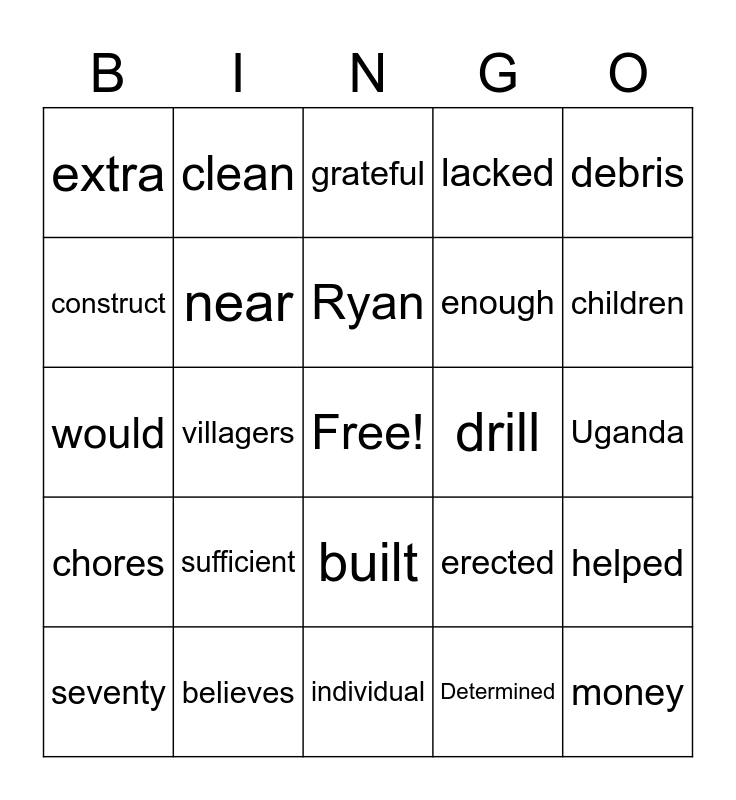 This bingo card has a free space and 24 words: seventy, sufficient, Ryan, Determined, debris, extra, clean, grateful, drill, Uganda, would, near, erected, helped, construct, believes, individual, lacked, children, chores, villagers, built, enough and money.