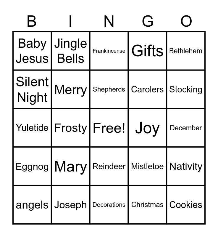 This bingo card has a free space and 24 words: Mary, Joseph, Shepherds, angels, Bethlehem, Baby Jesus, Silent Night, Jingle Bells, Joy, Reindeer, Carolers, Yuletide, Mistletoe, Nativity, Merry, Christmas, December, Frankincense, Stocking, Frosty, Cookies, Eggnog, Gifts and Decorations.