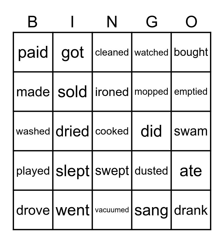 This bingo card has 25 words: slept, vacuumed, ironed, drove, bought, paid, made, got, did, swept, mopped, washed, dusted, ate, sold, drank, swam, cleaned, emptied, dried, cooked, went, played, watched and sang.