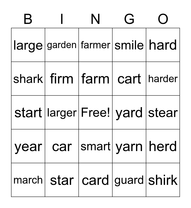 This bingo card has a free space and 24 words: car, star, farm, march, hard, large, shark, garden, yard, smart, cart, start, yarn, herd, firm, guard, stear, farmer, harder, larger, shirk, year, smile and card.
