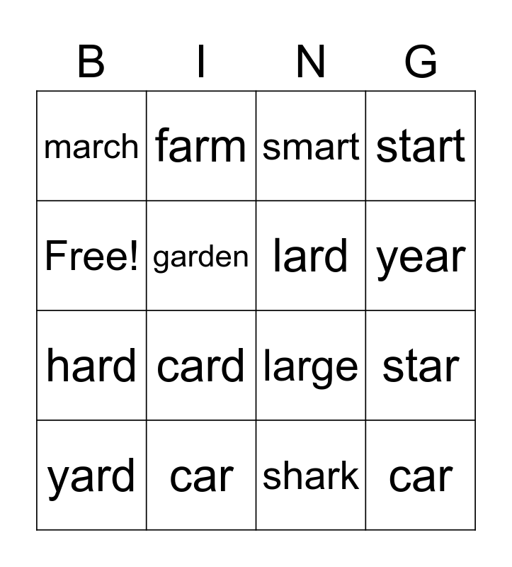 This bingo card has 16 words: car, star, smart, march, hard, farm, large, shark, Free!, garden, yard, start, card, year, lard and car.