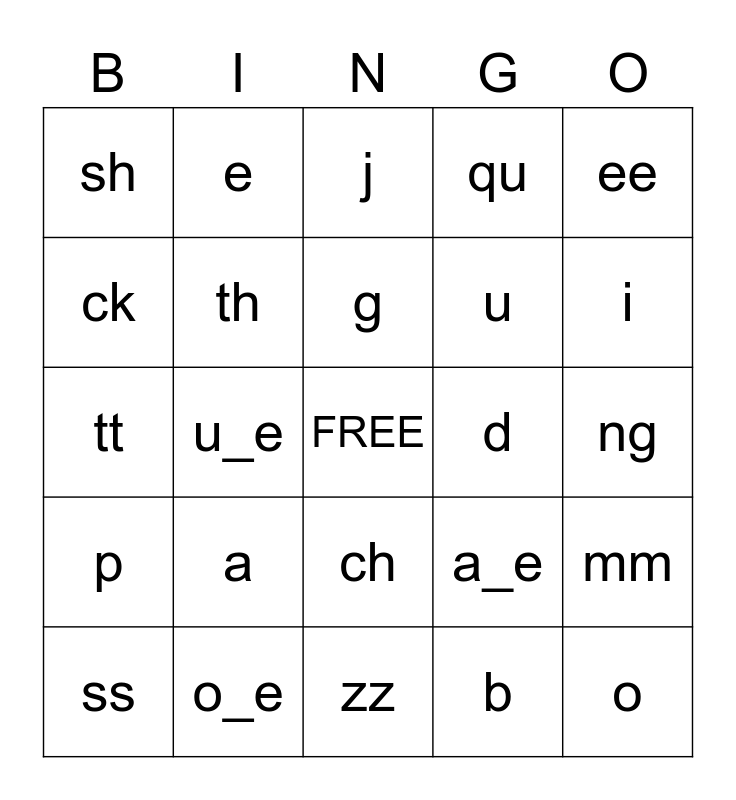 This bingo card has a free space and 24 words: a, o_e, g, ss, ee, sh, ck, e, d, ch, u, tt, a_e, mm, th, b, ng, j, i, u_e, o, p, qu and zz.
