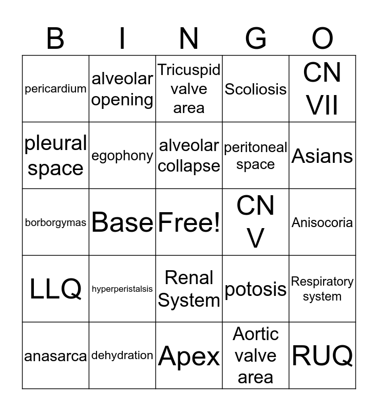This bingo card has a free space and 24 words: hyperperistalsis, dehydration, alveolar collapse, anasarca, CN VII, pericardium, pleural space, alveolar opening, CN V, Renal System, peritoneal space, borborgymas, potosis, Respiratory system, egophony, Aortic valve area, Anisocoria, Tricuspid valve area, Asians, Base, RUQ, LLQ, Scoliosis and Apex.