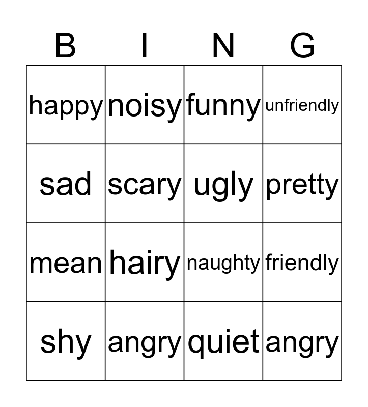 This bingo card has 16 words: angry, friendly, funny, happy, mean, noisy, naughty, quiet, sad, scary, shy, unfriendly, hairy, pretty, ugly and angry.