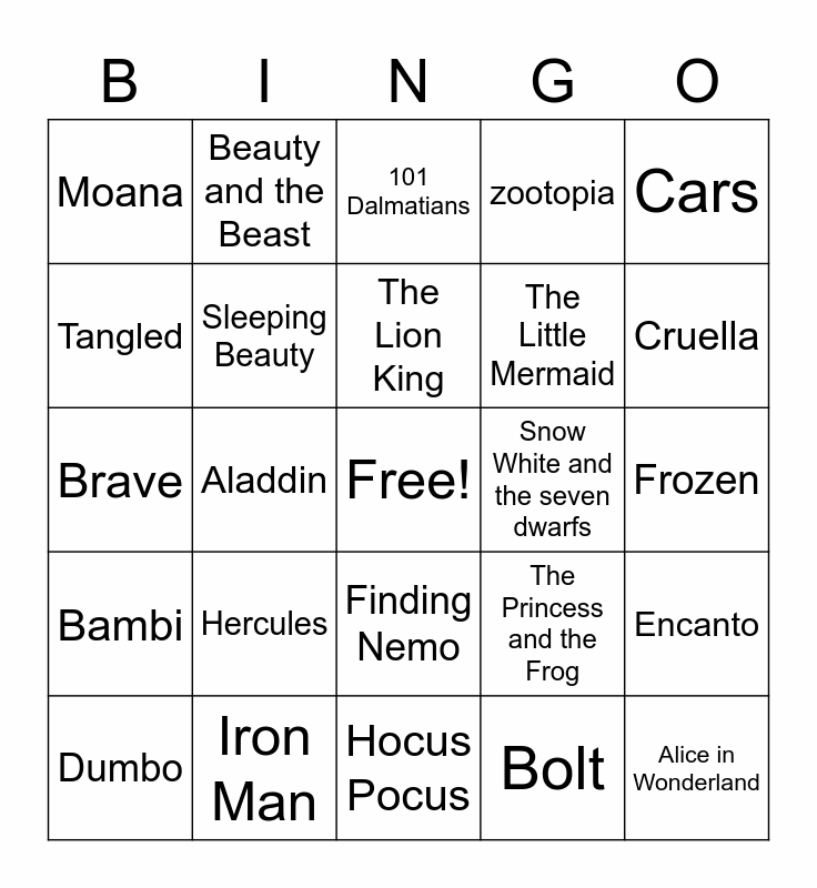 This bingo card has a free space and 24 words: Hercules, Iron Man, The Lion King, Dumbo, Cars, Moana, Tangled, Beauty and the Beast, Snow White and the seven dwarfs, Finding Nemo, The Little Mermaid, Brave, The Princess and the Frog, Encanto, Sleeping Beauty, Bolt, Frozen, 101 Dalmatians, Cruella, Aladdin, Alice in Wonderland, Bambi, zootopia and Hocus Pocus.