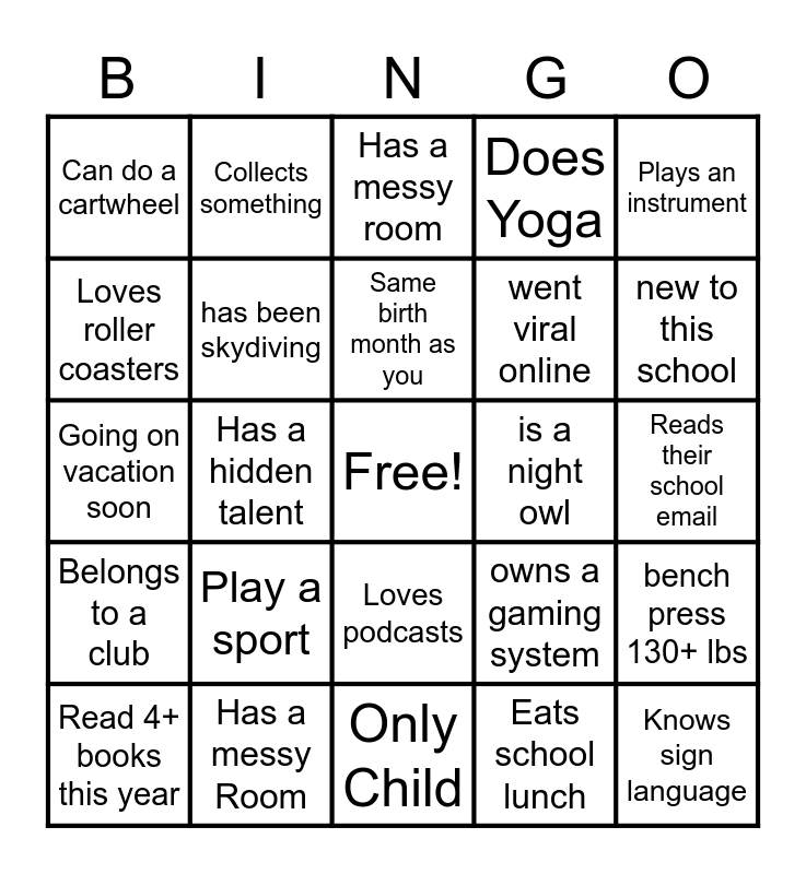 This bingo card has a free space and 24 words: Play a sport, Has a messy Room, Same birth month as you, Read 4+ books this year, Plays an instrument, Can do a cartwheel, Loves roller coasters, Collects something, is a night owl, Loves podcasts, went viral online, Going on vacation soon, owns a gaming system, bench press 130+ lbs, has been skydiving, Eats school lunch, Reads their school email, Has a messy room, new to this school, Has a hidden talent, Knows sign language, Belongs to a club, Does Yoga and Only Child.