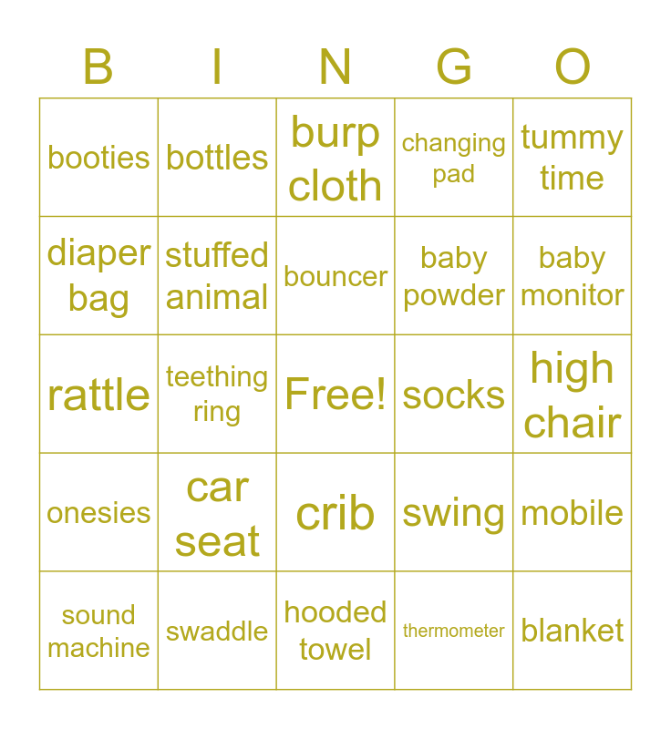 This bingo card has a free space and 28 words: mobile, bassinet, baby powder, thermometer, diaper bag, burp cloth, bottles, onesies, socks, sound machine, rattle, changing pad, swaddle, hooded towel, baby monitor, bibs, car seat, stuffed animal, bouncer, crib, booties, baby carrier, blanket, teething ring, high chair, swing, tummy time and stroller.