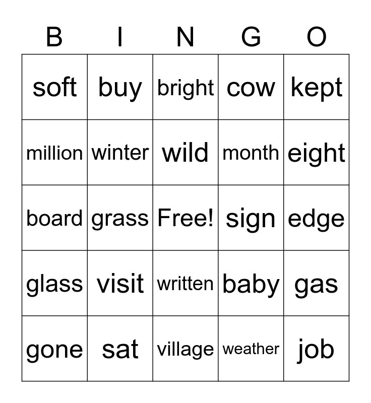 This bingo card has a free space and 40 words: sky, board, joy, winter, sat, written, wild, instrument, kept, glass, grass, cow, job, edge, sign, visit, past, soft, fun, bright, gas, weather, month, million, bear, finish, happy, hope, flower, clothe, strange, gone, jump, baby, eight, village, meet, root, buy and raise.