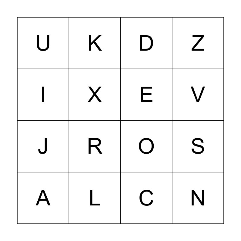 This bingo card has a free space and 15 words: A, N, D, U, V, I, R, C, X, J, S, Z, E, K and L.