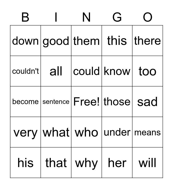 This bingo card has a free space and 43 words: with, will, him, his, her, her, them, they, there, that, this, those, who, what, when, why, where, become, because, too, good, bad, up, down, great, sad, front, behind, under, very, many, means, years, sentence, can, can't, don't, could, couldn't, know, not, all and maybe.
