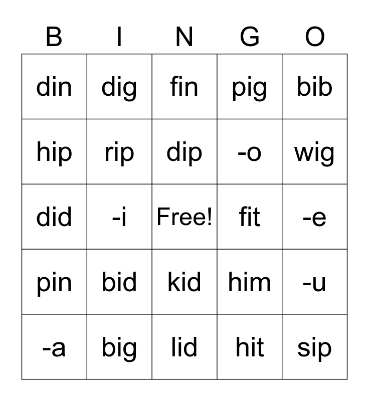 This bingo card has a free space and 24 words: bid, big, dip, -a, bib, din, hip, dig, fit, kid, -o, did, him, -u, rip, hit, -e, fin, wig, -i, sip, pin, pig and lid.