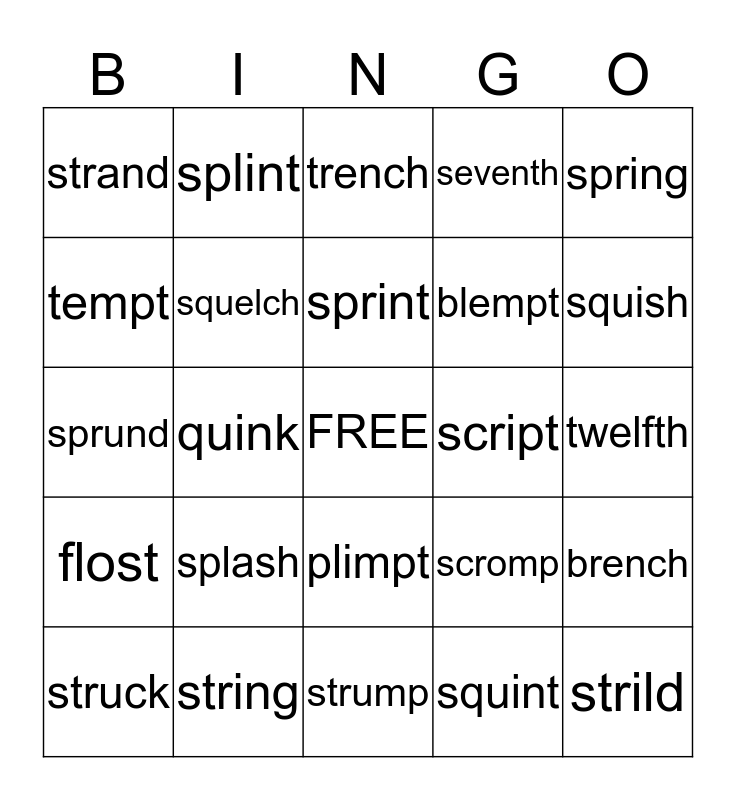 This bingo card has a free space and 24 words: splash, string, sprint, struck, spring, strand, tempt, splint, script, plimpt, blempt, sprund, scromp, brench, squelch, squint, twelfth, trench, squish, quink, strild, flost, seventh and strump.
