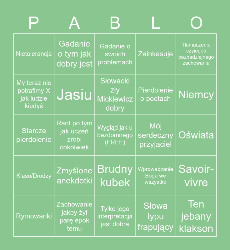 This bingo card has a free space and 24 words: Rymowanki, Zmyślone anekdotki, Słowacki zły Mickiewicz dobry, Słowa typu frapujący, Tłumaczenie czyjegoś beznadziejnego zachowania, Nietolerancja, Gadanie o tym jak dobry jest, Gadanie o swoich problemach, Mój serdeczny przyjaciel, Oświata, Starcze pierdolenie, Jasiu, Wprowadzanie Boga we wszystko, Savoir-vivre, My teraz nie potrafimy X jak ludzie kiedyś, Zachowanie jakby żył parę epok temu, Tylko jego interpretacja jest dobra, Zainkasuje, Niemcy, Klaso/Drodzy, Rant po tym jak uczeń zrobi cokolwiek, Brudny kubek, Pierdolenie o poetach and Ten jebany klakson.