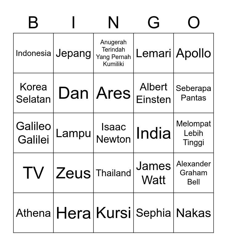 This bingo card has a free space and 24 words: Zeus, Hera, Ares, Athena, Apollo, Indonesia, Korea Selatan, Jepang, India, Thailand, Albert Einsten, Galileo Galilei, James Watt, Alexander Graham Bell, Dan, Sephia, Melompat Lebih Tinggi, Anugerah Terindah Yang Pernah Kumiliki, Seberapa Pantas, Lampu, Nakas, TV, Lemari and Kursi.