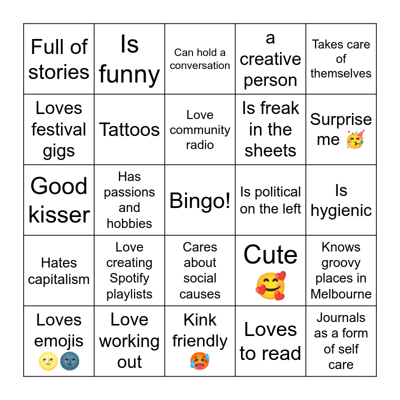 This bingo card has a free space and 24 words: Love creating Spotify playlists, Love working out, Love community radio, Loves emojis ππ, Takes care of themselves, Full of stories, Loves festival gigs, Is funny, Is political on the left, Cares about social causes, Is freak in the sheets, Good kisser, Cute π₯°, Knows groovy places in Melbourne, Tattoos, Loves to read, Is hygienic, Can hold a conversation, Surprise me π₯³, Has passions and hobbies, Journals as a form of self care, Hates capitalism, a creative person and Kink friendlyπ₯΅.