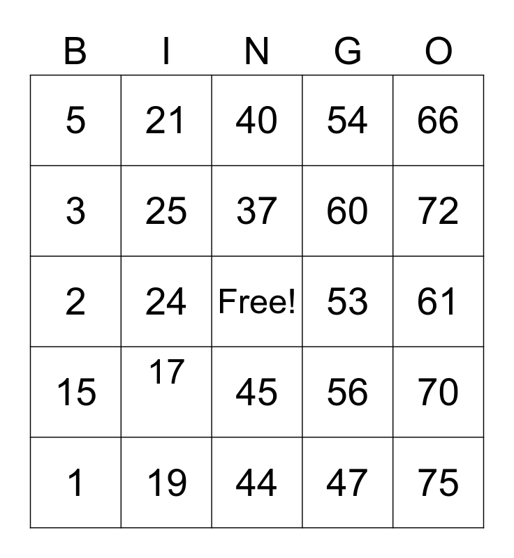 This bingo card has a free space and 24 words: 1, 17, 37, 47, 66, 5, 21, 40, 53, 61, 2, 25, 56, 70, 3, 19, 44, 54, 72, 15, 24, 45, 60 and 75.