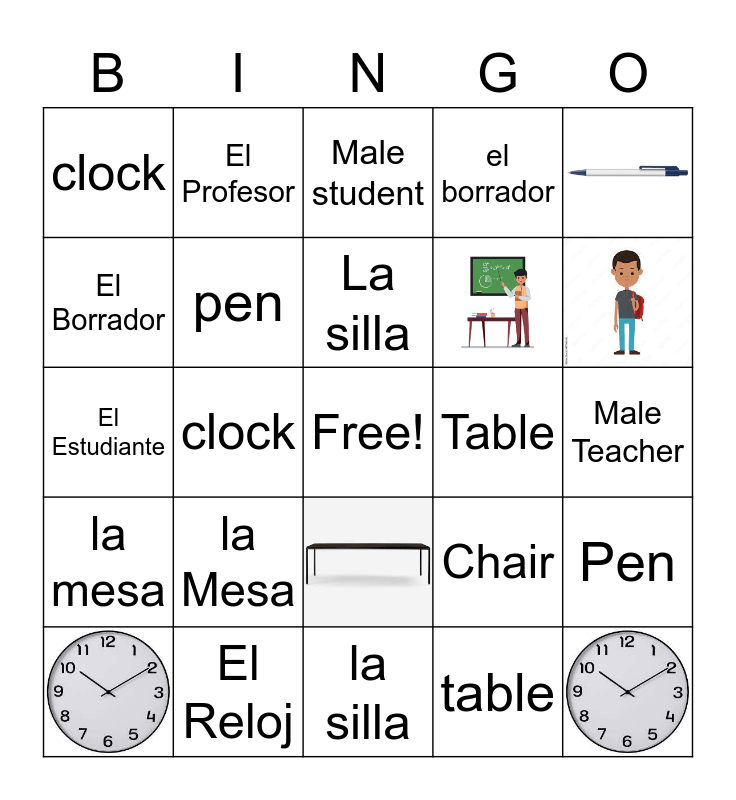This bingo card has 6 images, a free space and 18 words: la Mesa, El Reloj, La silla, clock, El Borrador, El Profesor, Table, El Estudiante, Chair, Pen, pen, table, Male Teacher, Male student, clock, la mesa, el borrador and la silla.