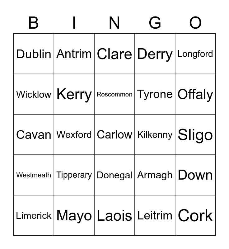 This bingo card has a free space and 29 words: Limerick, Galway, Wexford, Waterford, Dublin, Clare, Kerry, Tipperary, Kilkenny, Mayo, Sligo, Cork, Laois, Leitrim, Offaly, Kildare, Donegal, Westmeath, Longford, Cavan, Armagh, Monaghan, Tyrone, Wicklow, Derry, Antrim, Down, Roscommon and Fermanagh.