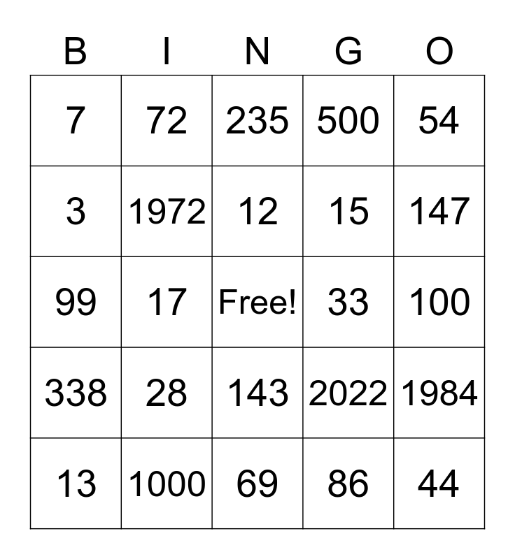 This bingo card has a free space and 24 words: 28, 1000, 12, 13, 54, 7, 3, 72, 33, 143, 15, 99, 2022, 1984, 1972, 86, 100, 235, 147, 17, 44, 338, 500 and 69.